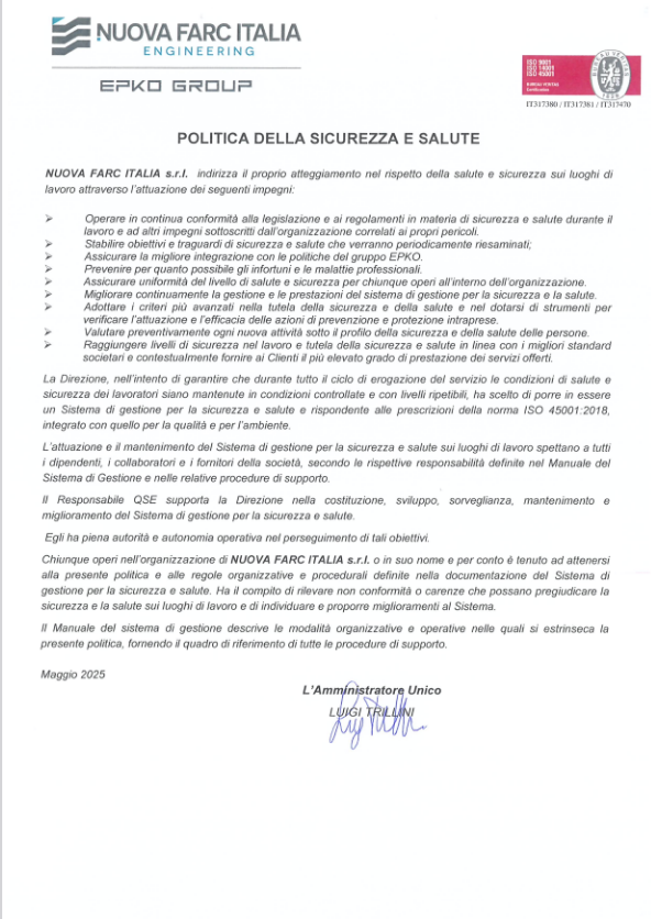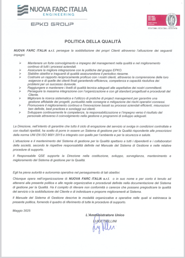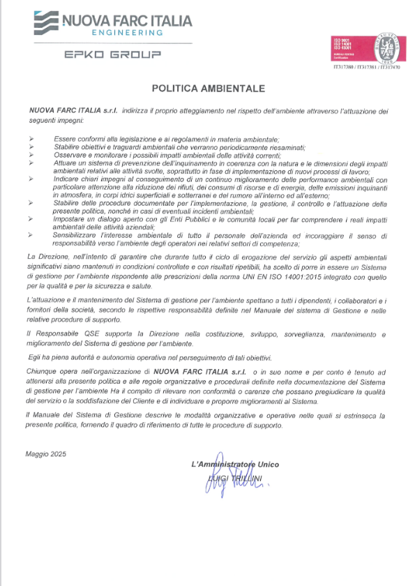 Dal 2024, Nuova Farc Italia è parte di Trillini Engineering, realtà consolidata nell’ingegneria multidisciplinare. Con un know-how avanzato in progettazione piping, modellazione 3D e tecnologie di rilievo, rafforza le capacità del gruppo e amplia le opportunità nei settori Oil & Gas e Clean Energy.